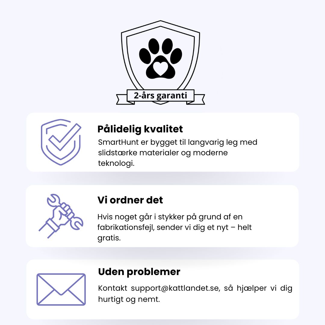 Hvis SmartHunt ikke bliver din kats nye favorit, giver vi dig et tilgodebevis på hele beløbet, som du kan bruge til at købe noget andet i vores butik. Garantien gælder for én (1) SmartHunt pr. kunde.