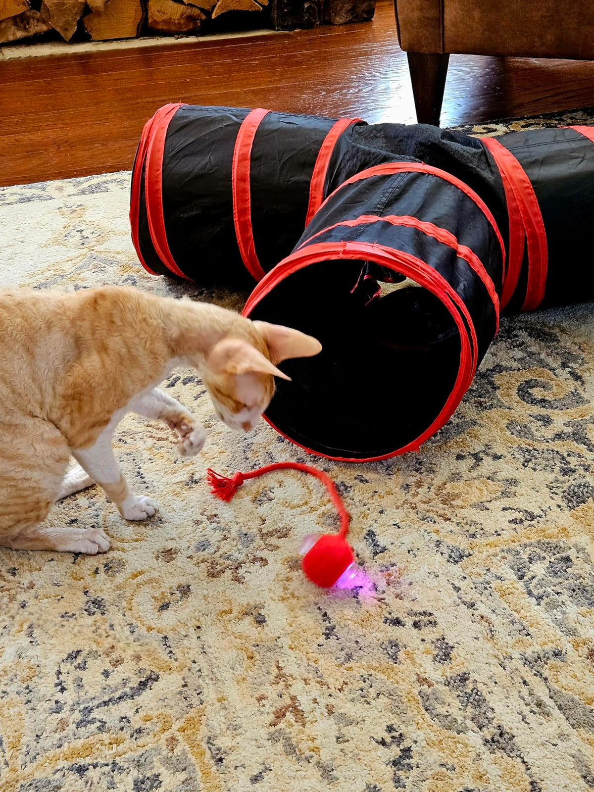 Katte er jægere af natur. At lege med en stillestående bold eller et tøjdyr er ikke nok – de har brug for at jage noget, der bevæger sig rigtigt, for at have det godt mentalt.